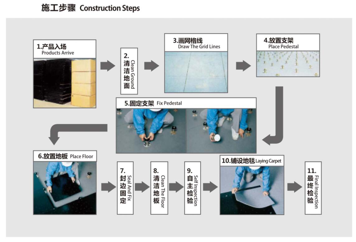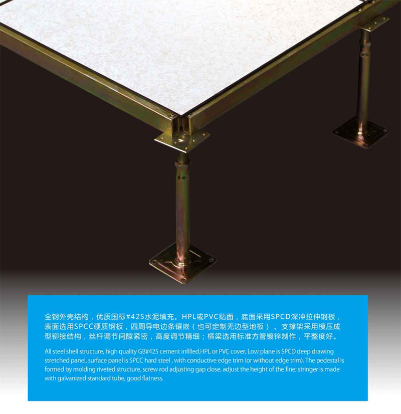 面板采用优质冷轧硬质钢板,底板采用深级拉伸钢板,上下钢板冲压点焊成型后,进行磷化喷塑处理,中间空壳填充优质高强度发泡水泥,经过养护后形成稳定的承载结构,上表面按需求可粘贴HPL、PVC、橡胶等防静电饰面。